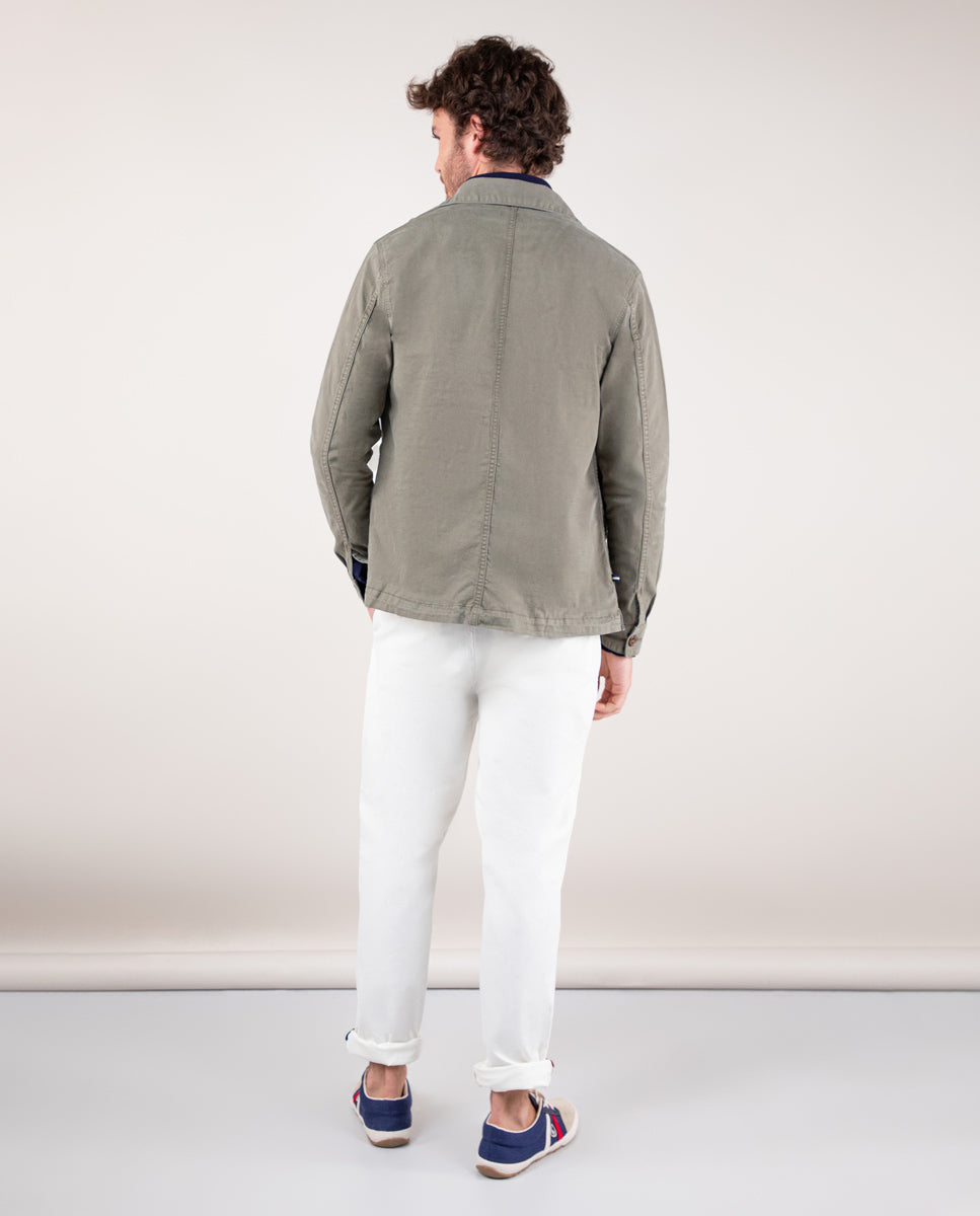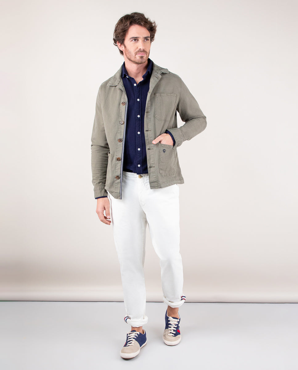 Sobrecamisa de hombre lisa confeccionada en lino. Para conseguir ese color desgastado, la prenda ha sido tintada con acabado sulfuroso. Corte Regular Fit, cuello clásico, bolsillos tipo parche y cierre con botones. Manga larga y detalle de cinta de 3mm en el borde de la tapilla interior. Lleva logo bordado en uno de los bolsillos de parche. Esta prenda cuenta con un lavado enzimático que le dará un aspecto desgastado.